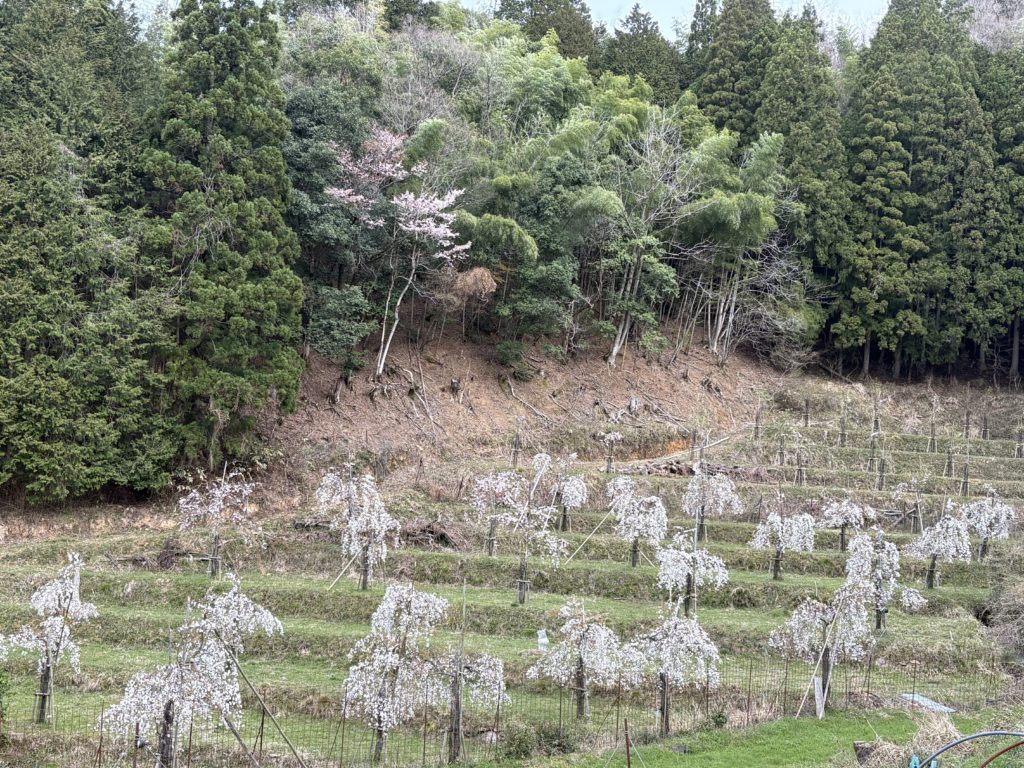 奥米地の恵まれた自然を生かし、更なる景観づくりを進めています。その一つが、しだれ桜の植樹です。桜の子どもたちが小さな枝にたくさんの花びらを付け、誇らしそうに咲き誇っています。将来、この子どもたちが桜の名所になってくれることを懇願しています。【OHK広報】